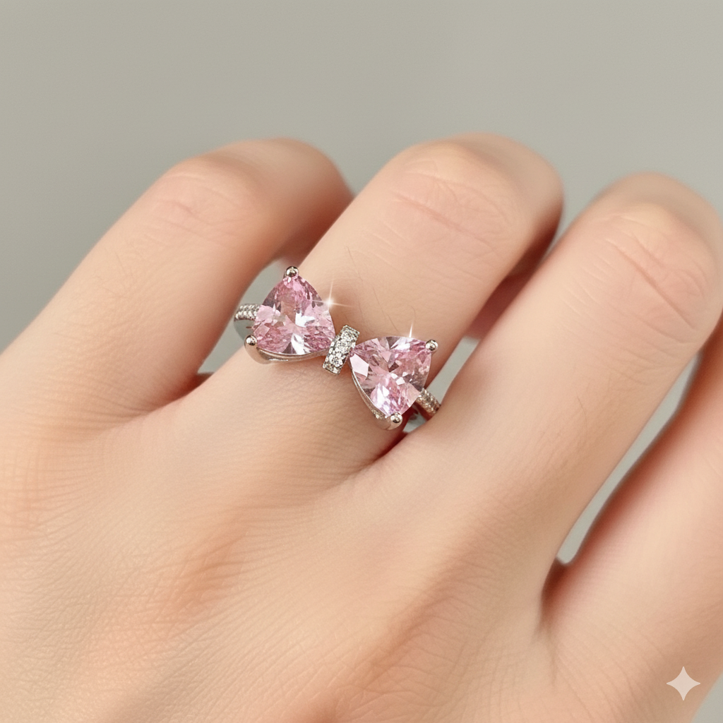 The Pink Bow Sparkle Ring is a charming piece that blends sweetness with elegance. Featuring two pink heart-shaped stones forming a delicate bow, this ring sparkles with extra brilliance from its crystal-accented band. Its silver-tone finish adds timeless beauty, making it perfect for daily wear or as a romantic surprise. Add the Pink Bow Sparkle Ring to your jewelry collection today, exclusively available at BabyGirl. 💍