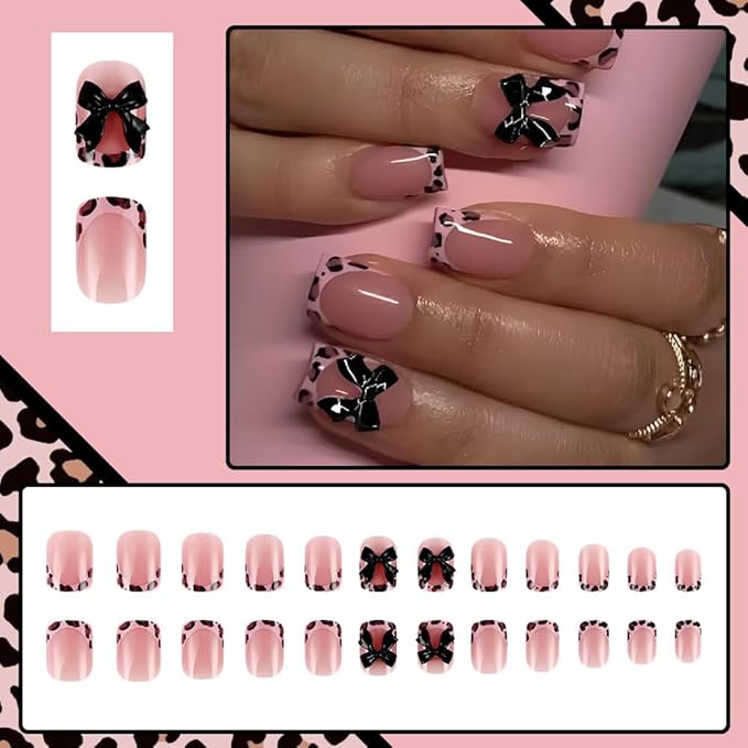 These Pink Leopard French Tip Press On Nails bring the perfect mix of bold, cute, and glam. Designed with a glossy nude-pink base, edgy leopard-print French tips, and a striking black bow accent, this set adds instant personality to any look. Lightweight, durable, and beginner-friendly, they offer a flawless salon-style manicure in just minutesβ€”ideal for parties, photoshoots, or everyday glam vibes.