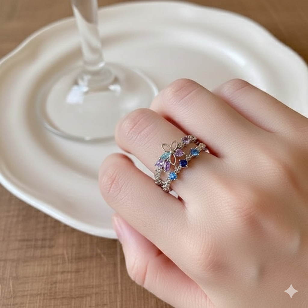 The Silver Bloom Crystal Ring is a delicate piece of jewelry that radiates elegance and charm. Designed with a floral centerpiece and adorned with sparkling blue and violet crystals, this ring brings a refreshing and graceful look. Its silver-tone adjustable band ensures both comfort and style, making it perfect for everyday wear or gifting. Add the Silver Bloom Crystal Ring to your collection today, exclusively available at BabyGirl. π