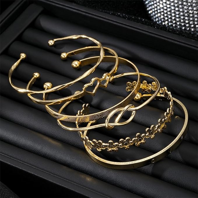 💛 Golden Love Stack Bracelet Set – 6 Piece Floral & Heart Bangles ✨