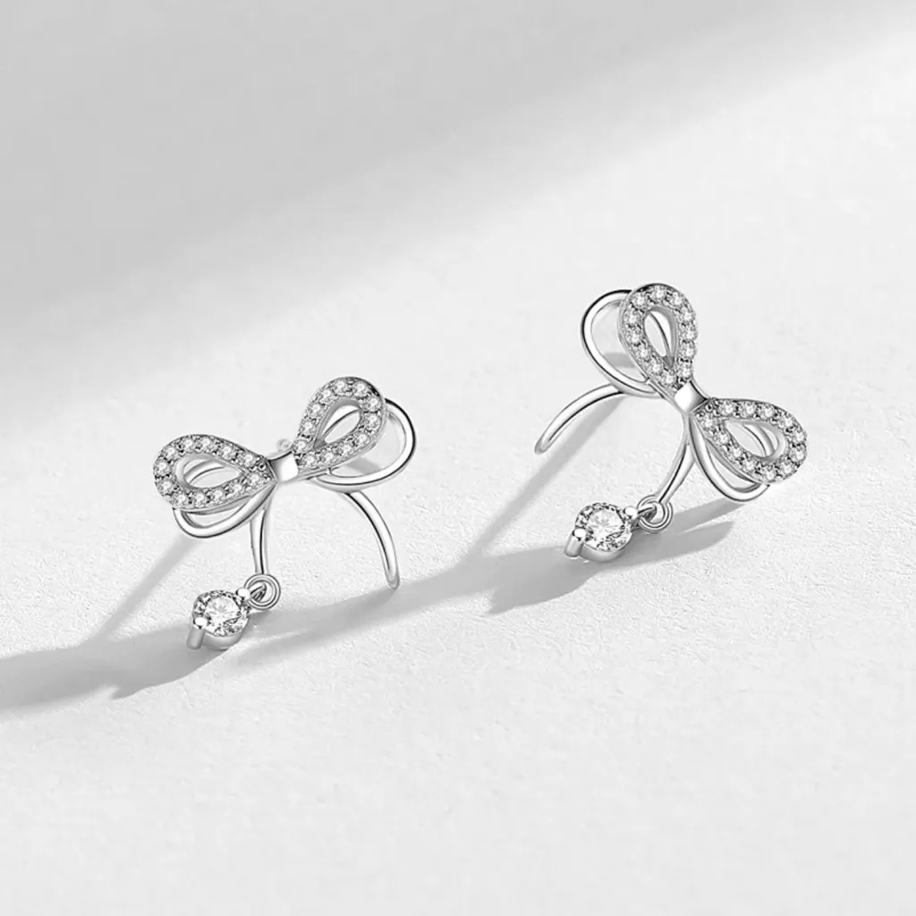 ๐คSparkling Ribbon Bow Earrings | Silver Crystal Drop Stud Jewelry