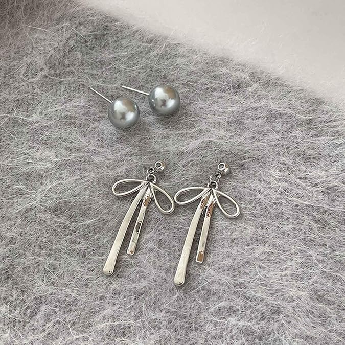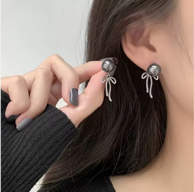 π©Ά Silver Pearl Ribbon Earrings | Elegant Bow Dangle Jewelry