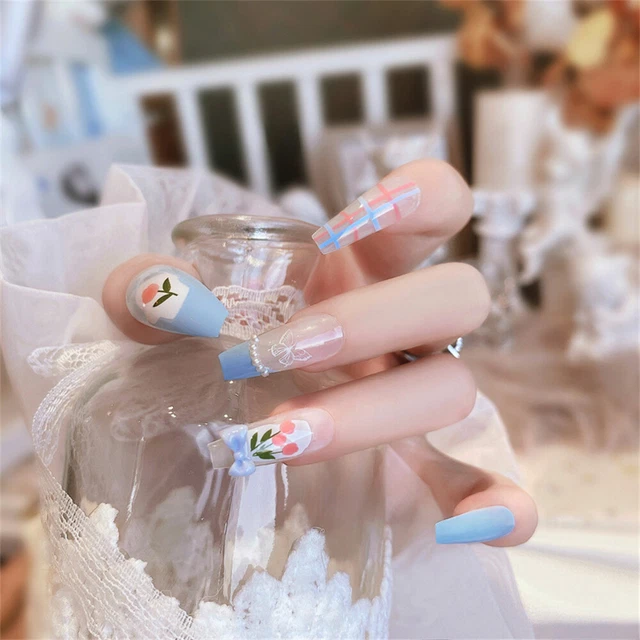 Blossom Sky Press-On Nails β Elegant Blue Floral Nails with Delicate Designs πΈπβ¨