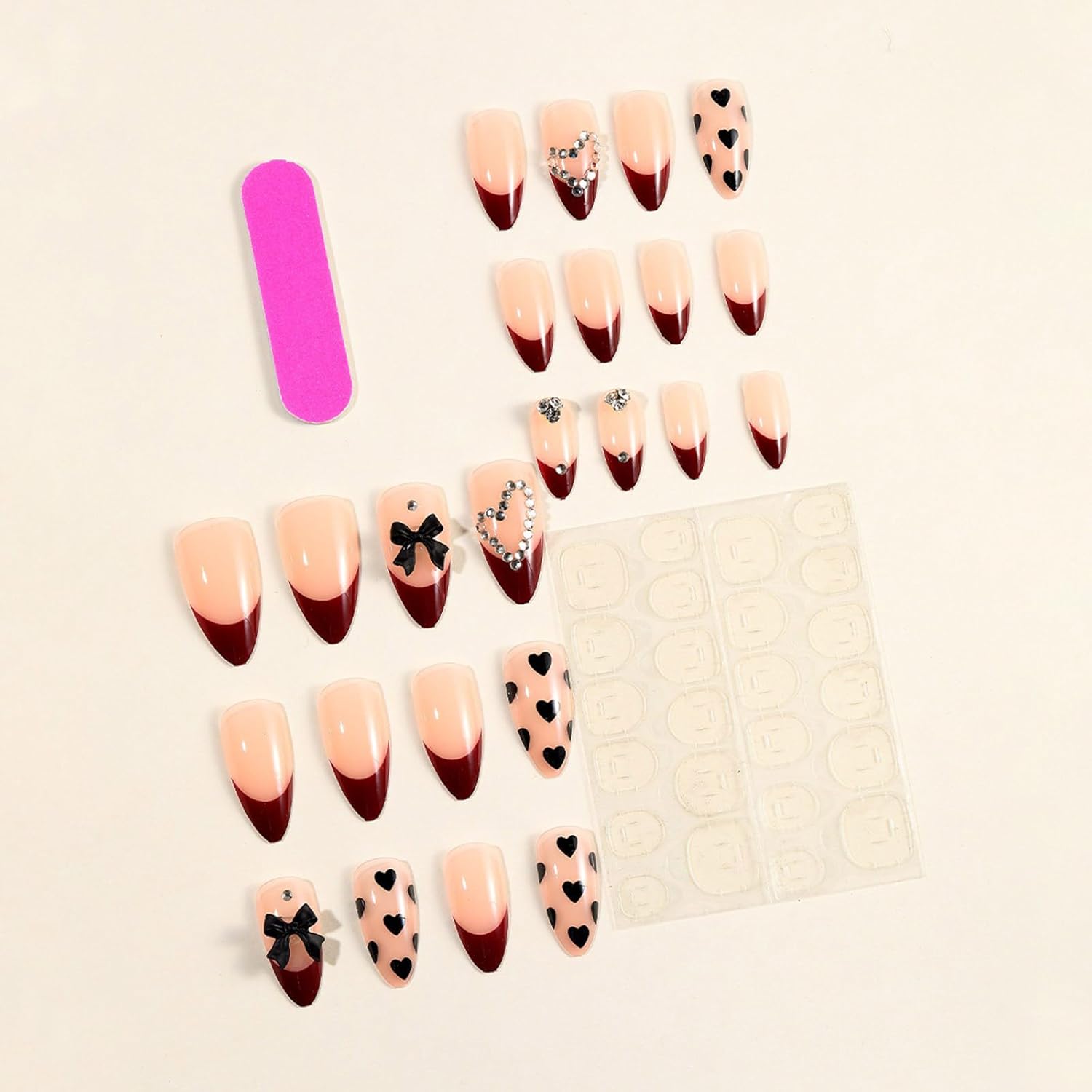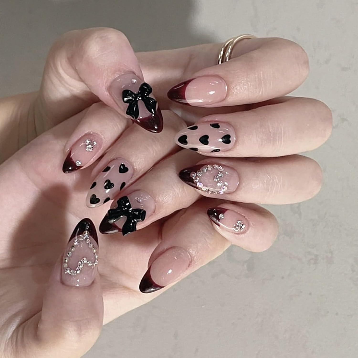 Glam Bow Heart Press-On Nails β Chic Black & Nude Nail Art with Bows & Hearts π€πβ¨