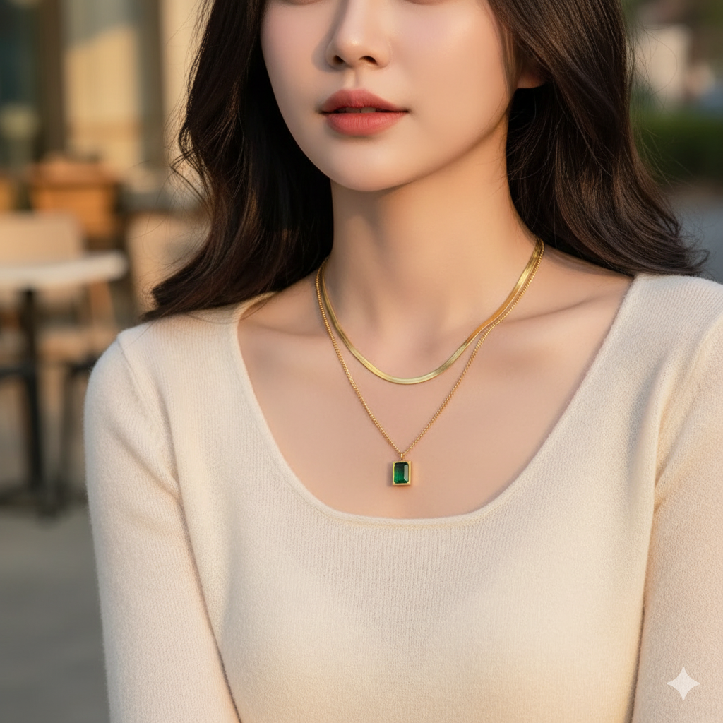 Luxe Emerald Layers Necklace π β Double Layered Gold Green Gem Pendant (Anti-Tarnish)