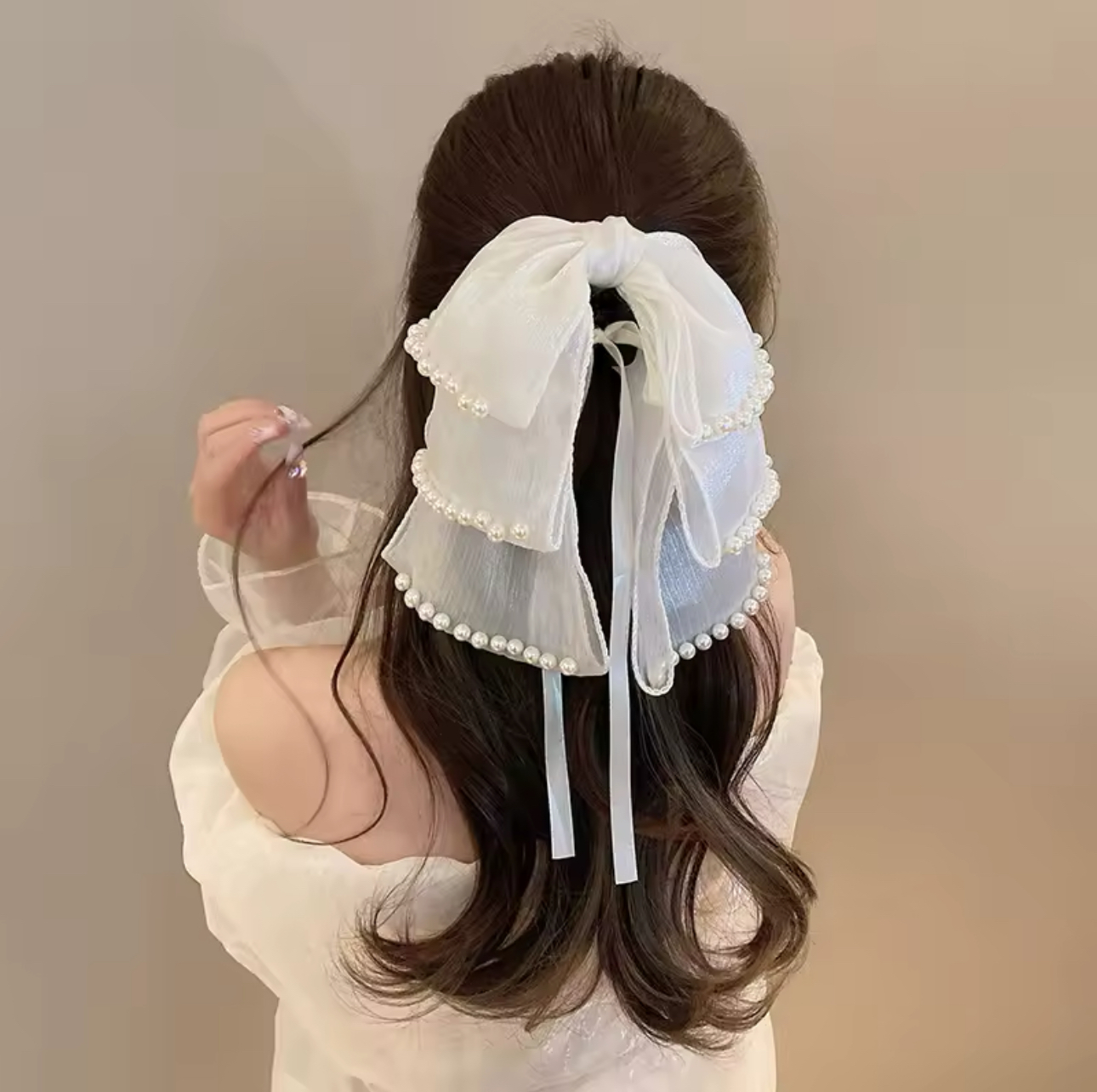 Pearl Elegance Ribbon Bow β Luxury Sheer Hair Clip π€